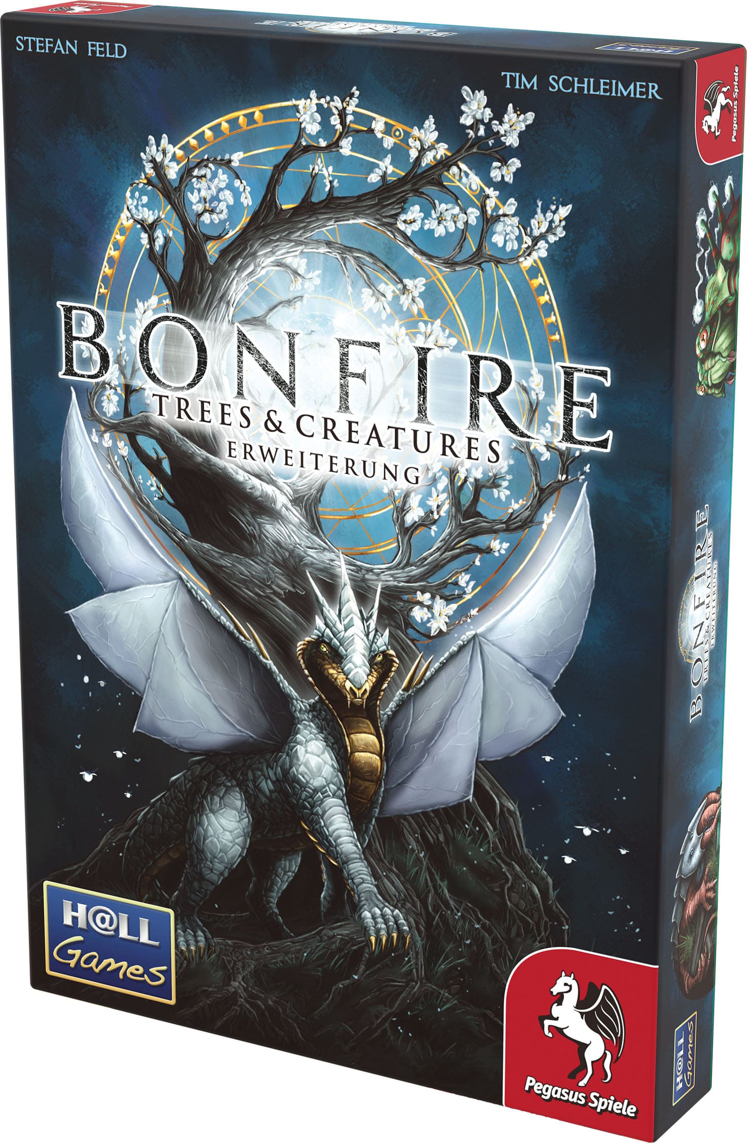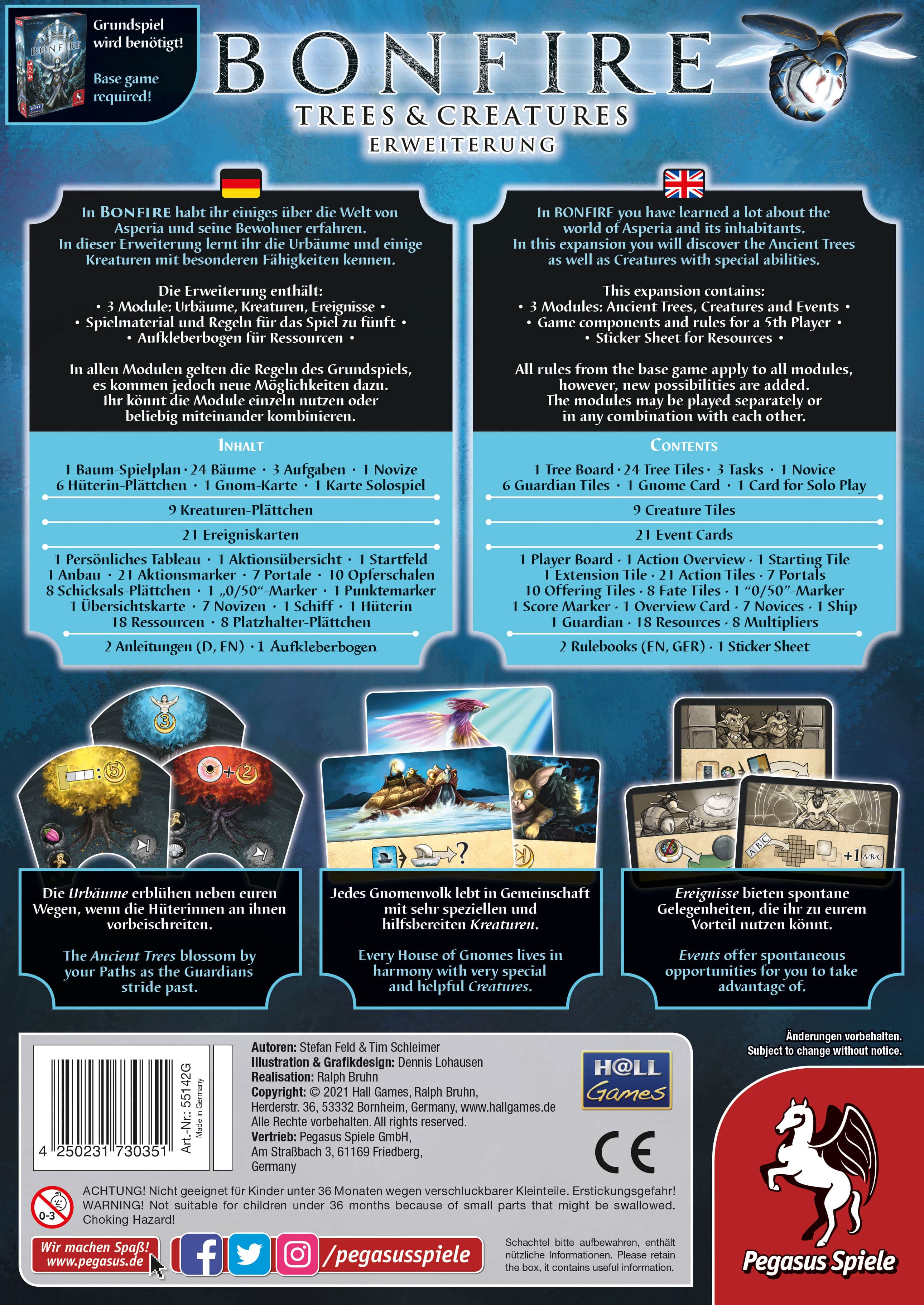Bonfire: Trees & Creatures contains the three modules Ancient Trees, Creatures and Events as well as game components for a fifth player and a sticker sheet for the resources. The modules can be added to the base game separately as well as in any combination and offer the players new possibilities.