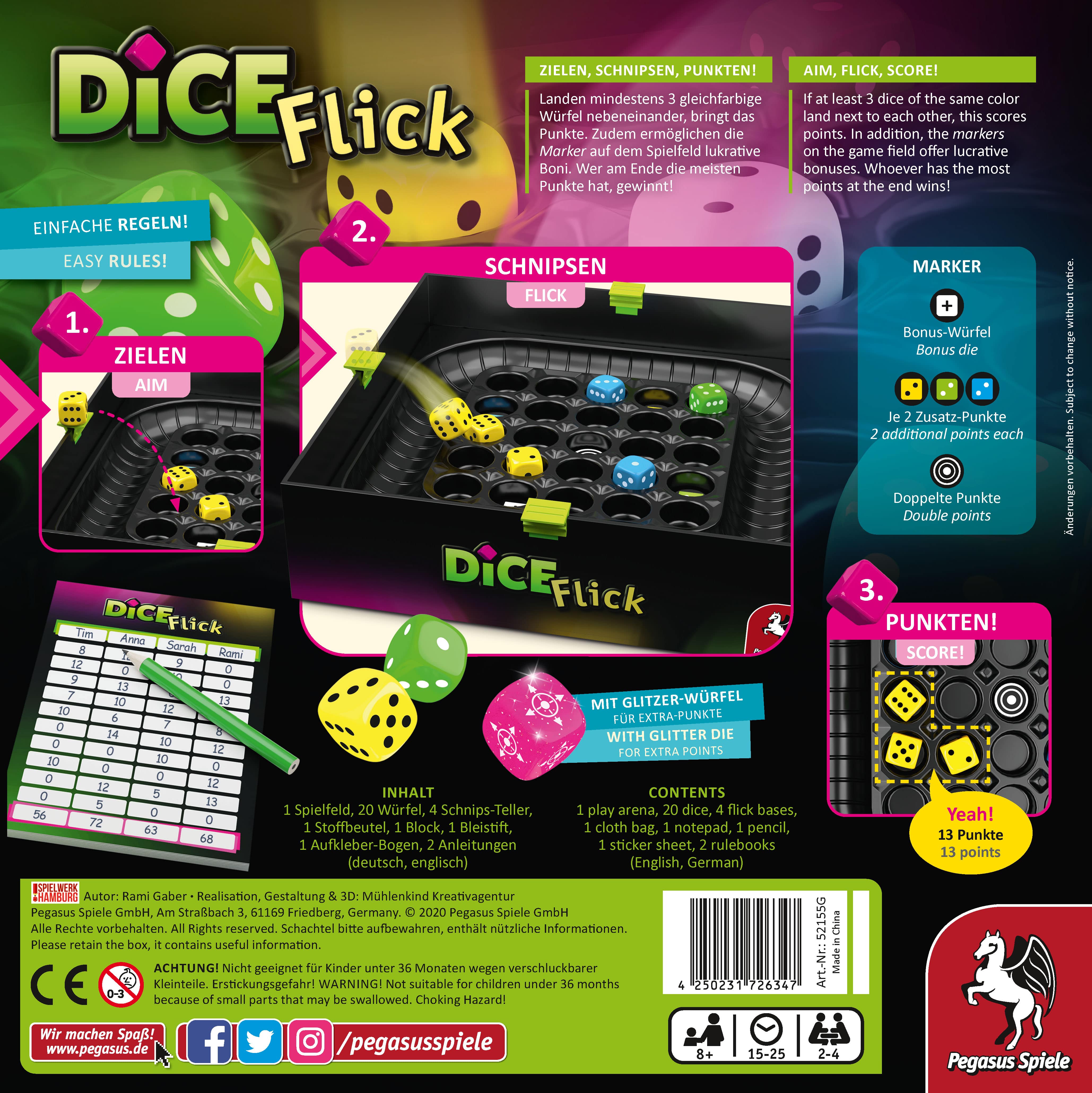 | Content: | 1 play arena 20 dice 4 flick bases 1 cloth bag 1 notepad 1 pencil 1 sticker sheet 2 rulebooks (English, German) |
