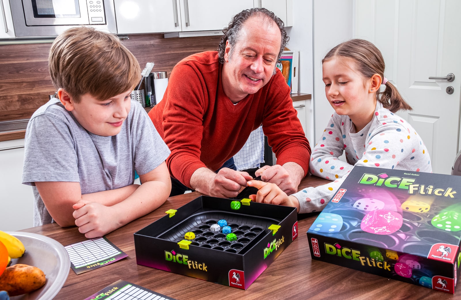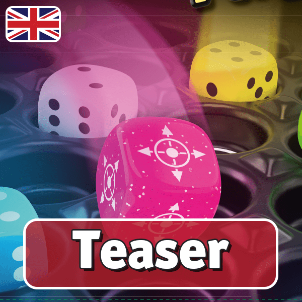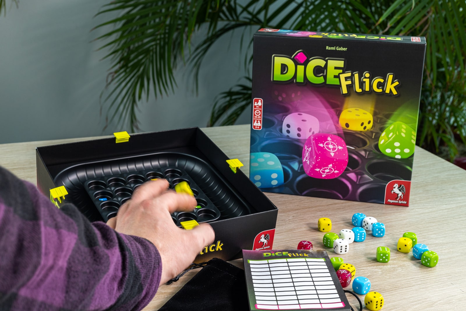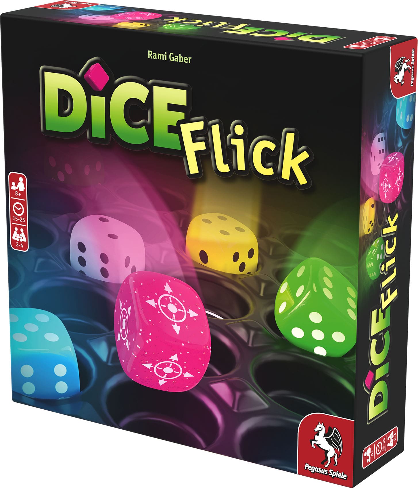 Well flicked is half-way won in Dice Flick: In the game 2 to 4 players compete to score the most points in ten rounds. To do so, they draw dice from a bag each turn and flick two of them onto the playing area, which is mounted inside the game box. Three adjacent dice of the same color can be scored and are returned into the bag. Dice landing in the middle of the board grant double the points and can even be scored by themselves. While white dice serve as jokers, the pink, glittering dice trigger a special scoring. Players who make best use of the dice's abilities and have good aim are bound to win the game.