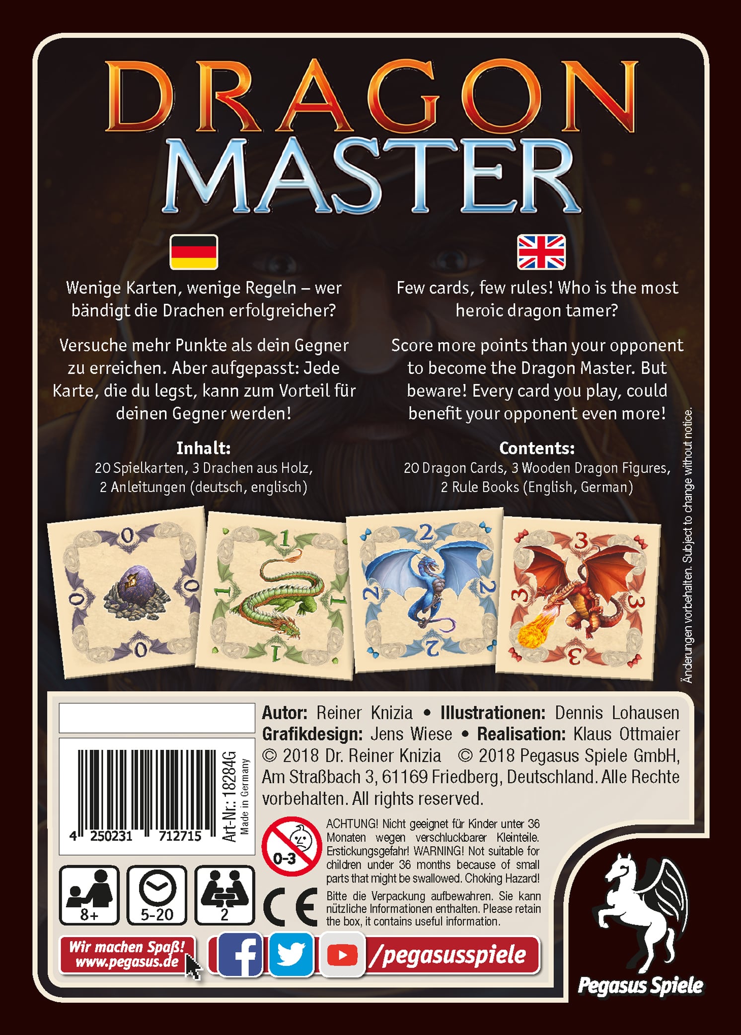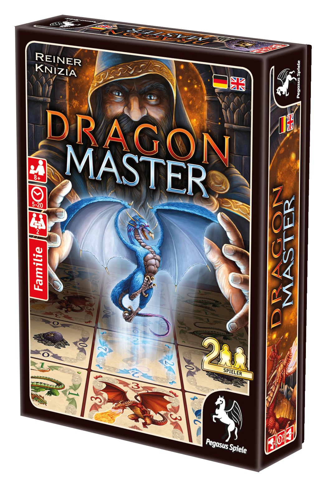 A group of dragons is only as strong as their weakest member – that’s the first thing a Dragon Master learns. This tactical duel game is played on an imaginary 4x4 grid, one player will score the vertical lines, the other player the horizontal lines of the grid. To start, both players are dealt eight cards with values from 0 to 3 and alternately play them into the 4x4 grid, always adjacent to at least one previously played card. Once 16 cards are played, the lines are scored: Single dragons count their printed value. Two identical dragons get a x10 multiplier for their value. Three or more identical dragons of any value score 100 points. However, in the end the player with the lowest scoring line loses, regardless their overall score. Dragon Master is a slick, quick-playing card game that requires players to make tactical decisions each turn and keep their score balanced along the way.
