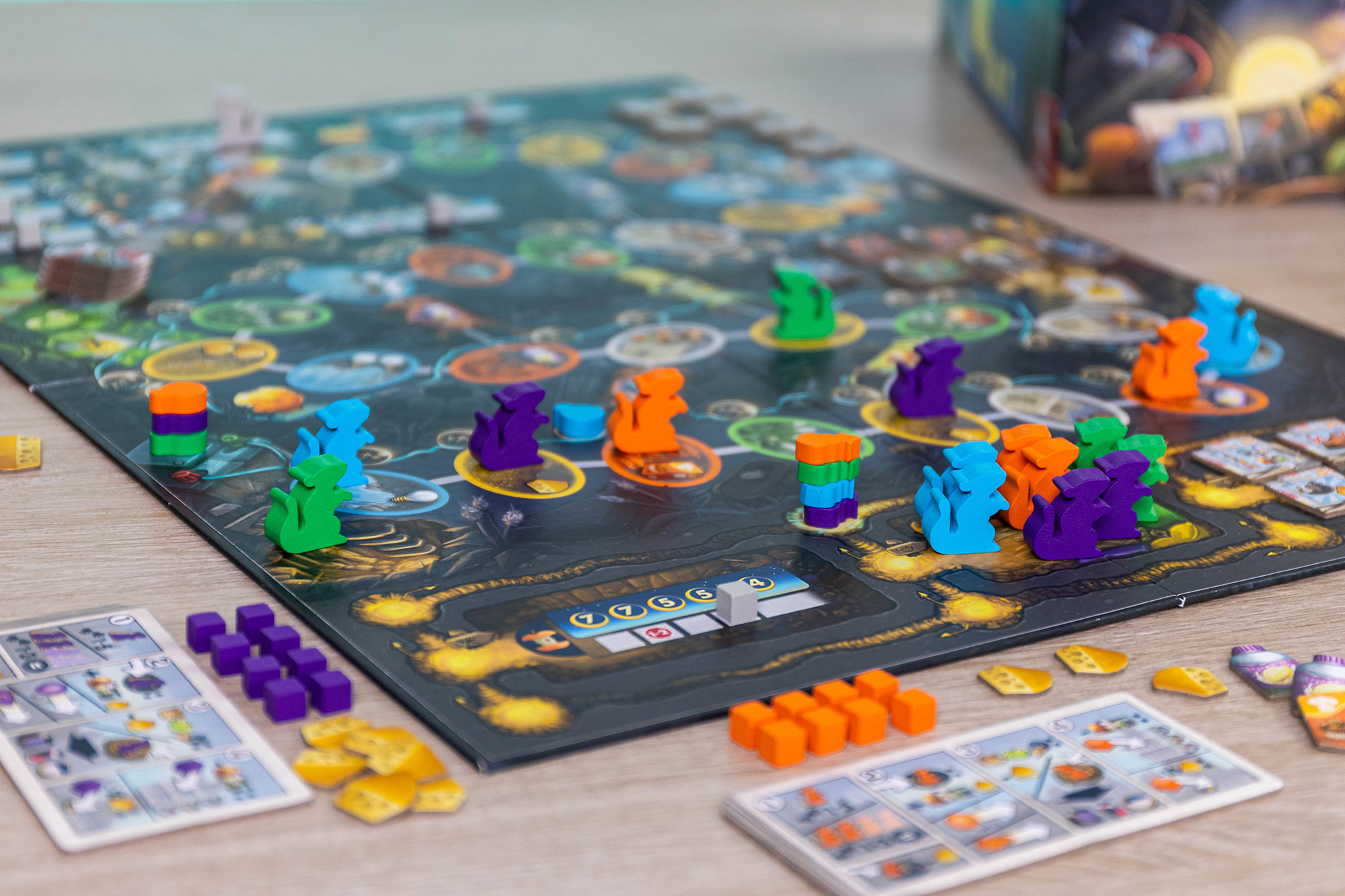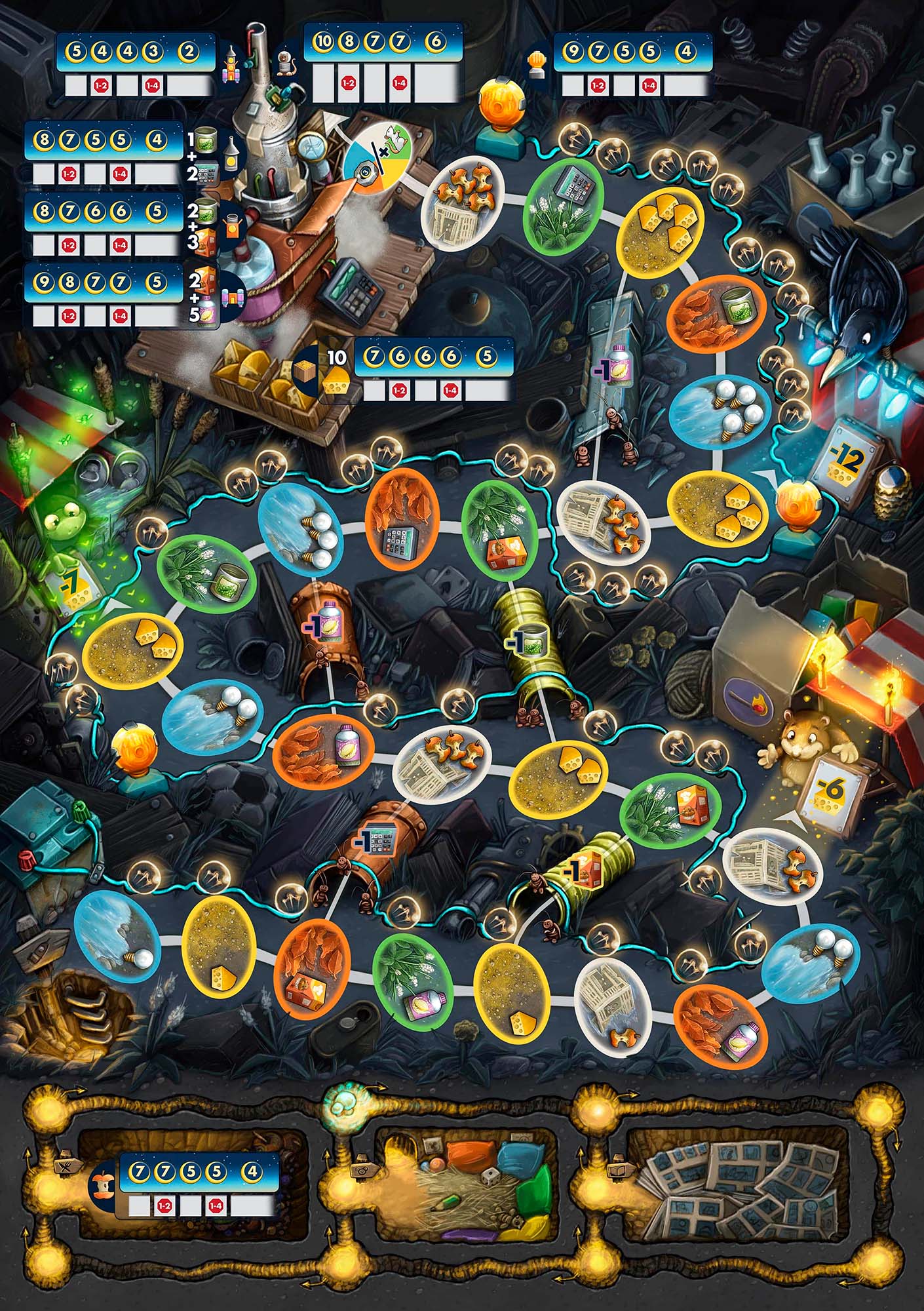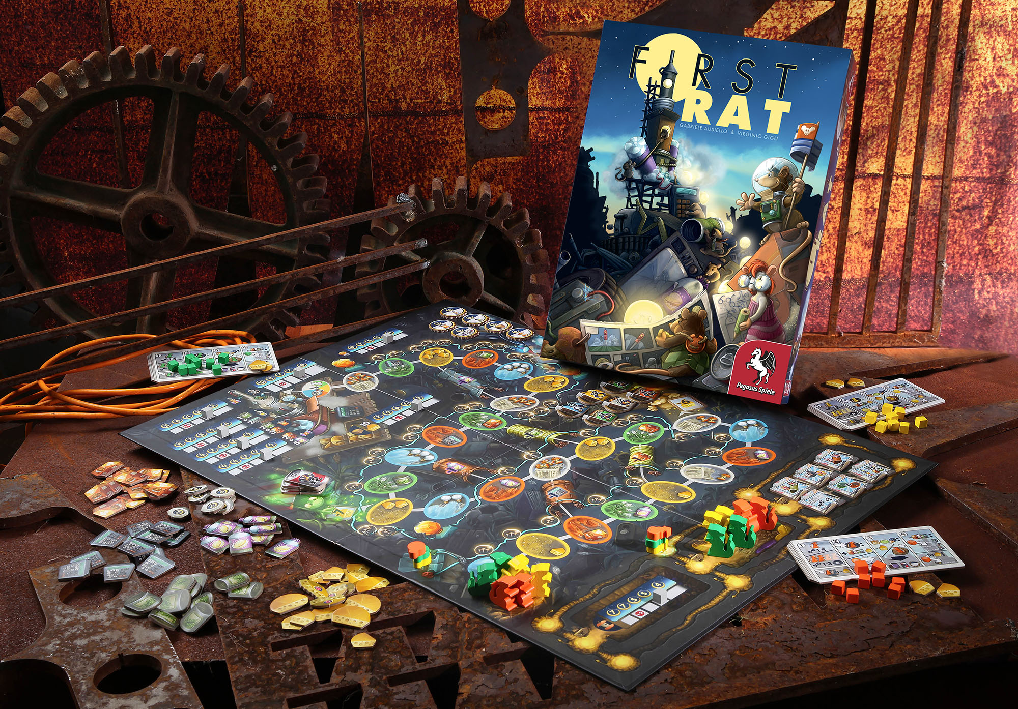 First Rat is a Core Game for up to five players, which can also be played solo. Numerous strategies, special skills, and a variable setup create new excitement for every game. On every turn, players have to decide whether they want to move one of their rats up to five spaces or if they want to move multiple rats up to three spaces instead – which is only possible if the rats end their movement on spaces of the same color. And if there are already rats in that space, it also costs one cheese per rat! Moving across the junkyard, players collect resources, buy (or steal) useful items, build parts of the rocket or train their Rattronauts, in order to collect as many Victory Points as possible. Who will be the First Rat?