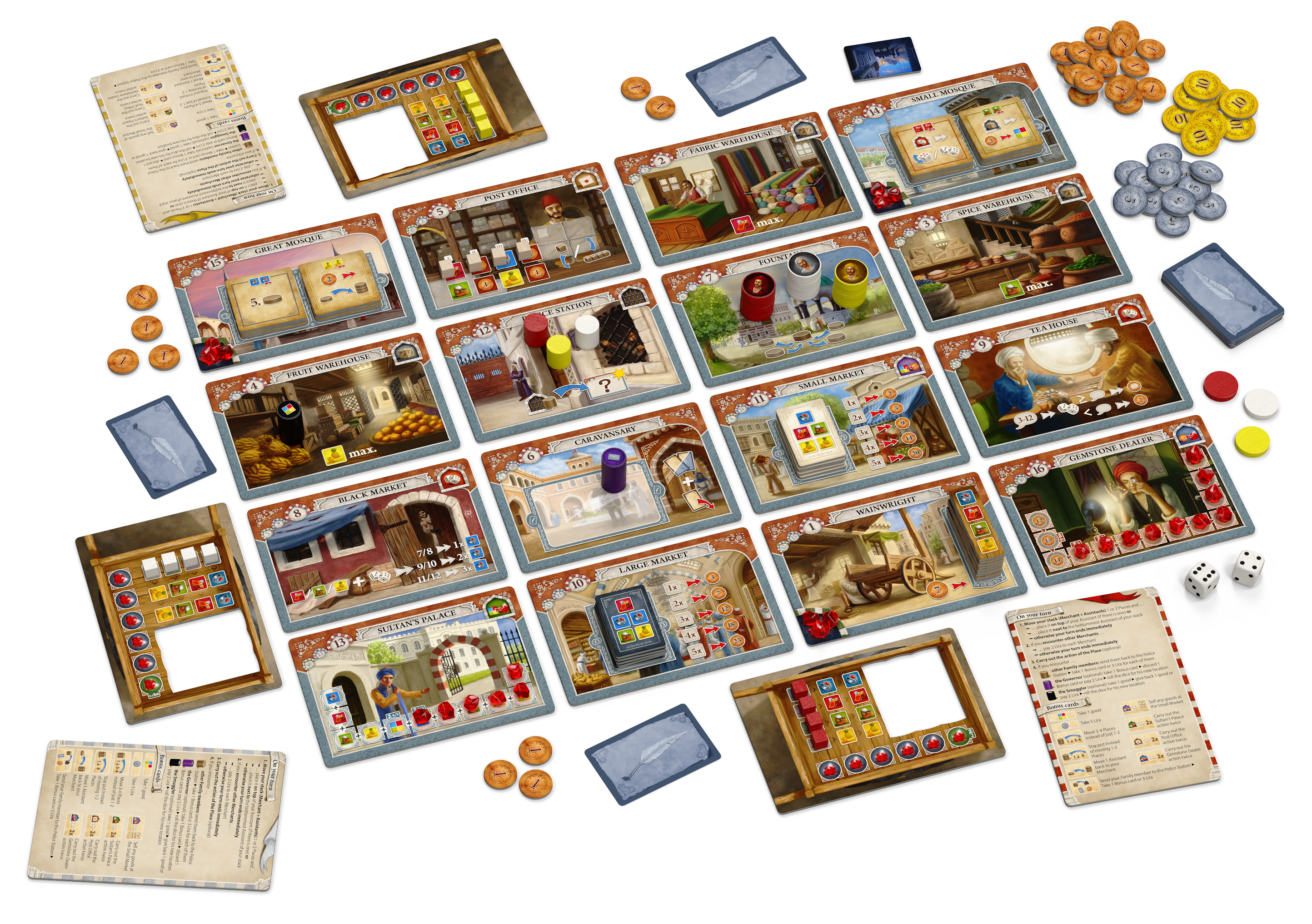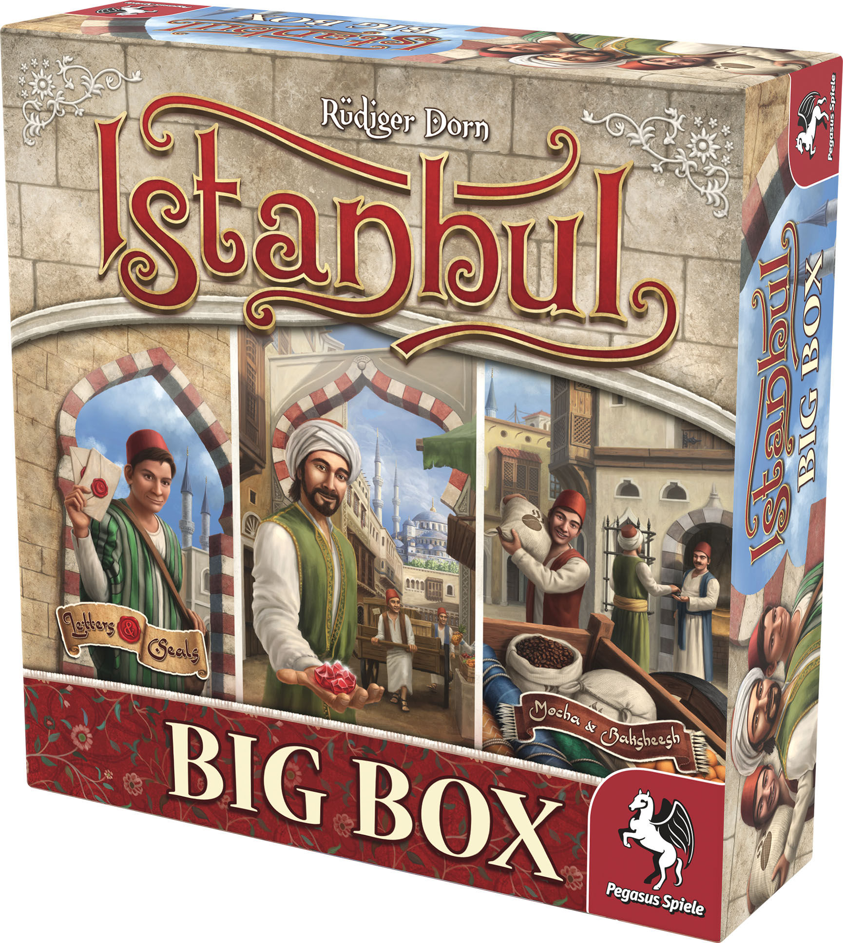 Istanbul: Big Box combines the award-winning classic game Istanbul, with both expansions, Mocha & Baksheesh and Letters & Seals. This combination allows players to build an epic-sized market of 5 x 5 tiles.