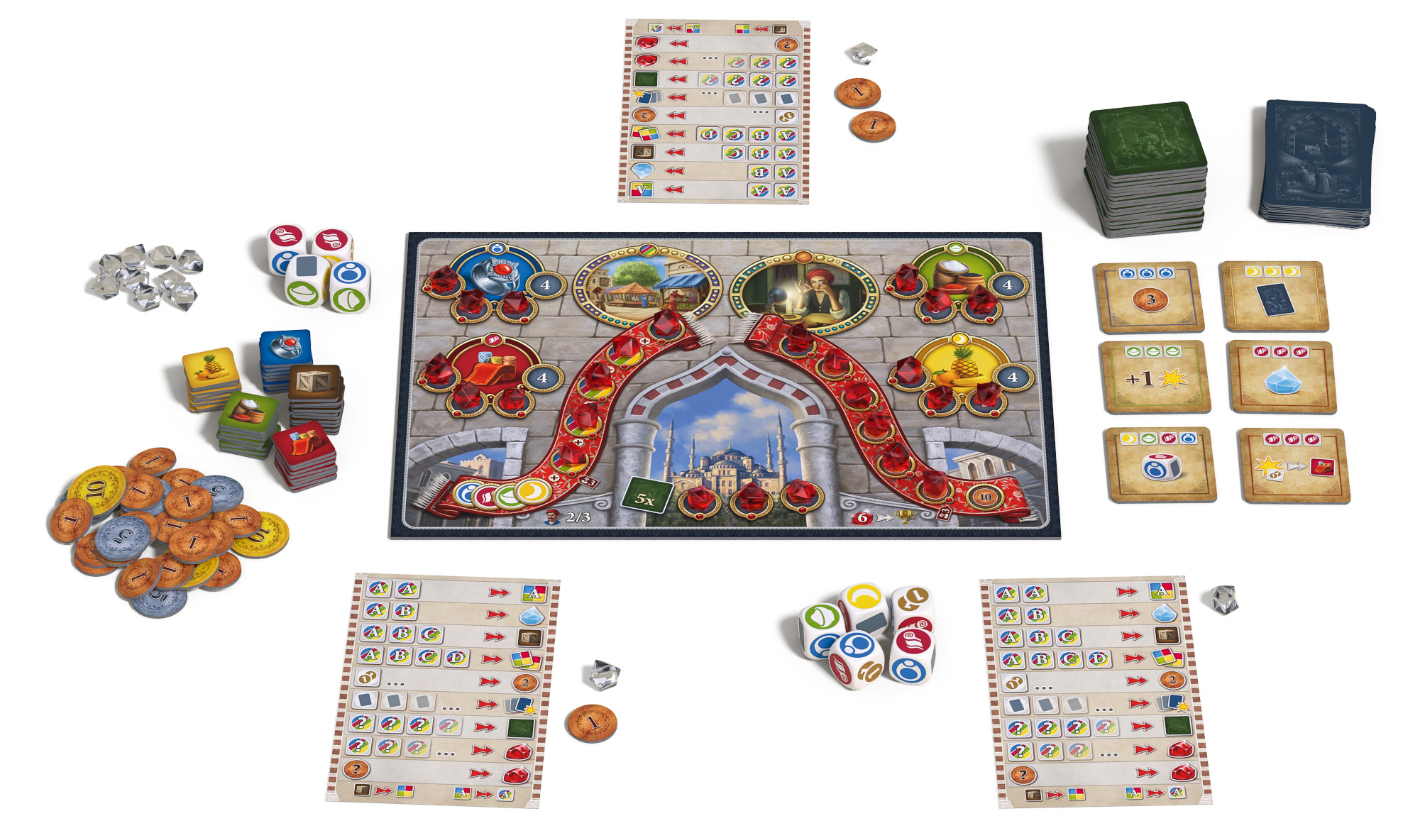 Welcome to the Bazaar of Istanbul! As cunning merchants, players need to outdo their competitors in order to become the sole Master of the Trade Guild. Turn after turn, they contend with each other for money and goods. Their faithful assistants, represented by custom dice, support the players in their endeavours. Using their income wisely, players can invest in improved abilities or purchase the much-desired rubies straight-away. With a little bit of luck and the right strategy, the first player to collect a certain amount of rubies will come out victorious as the next Master of the Trade Guild.