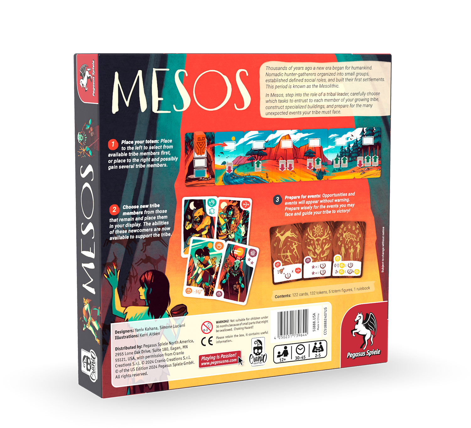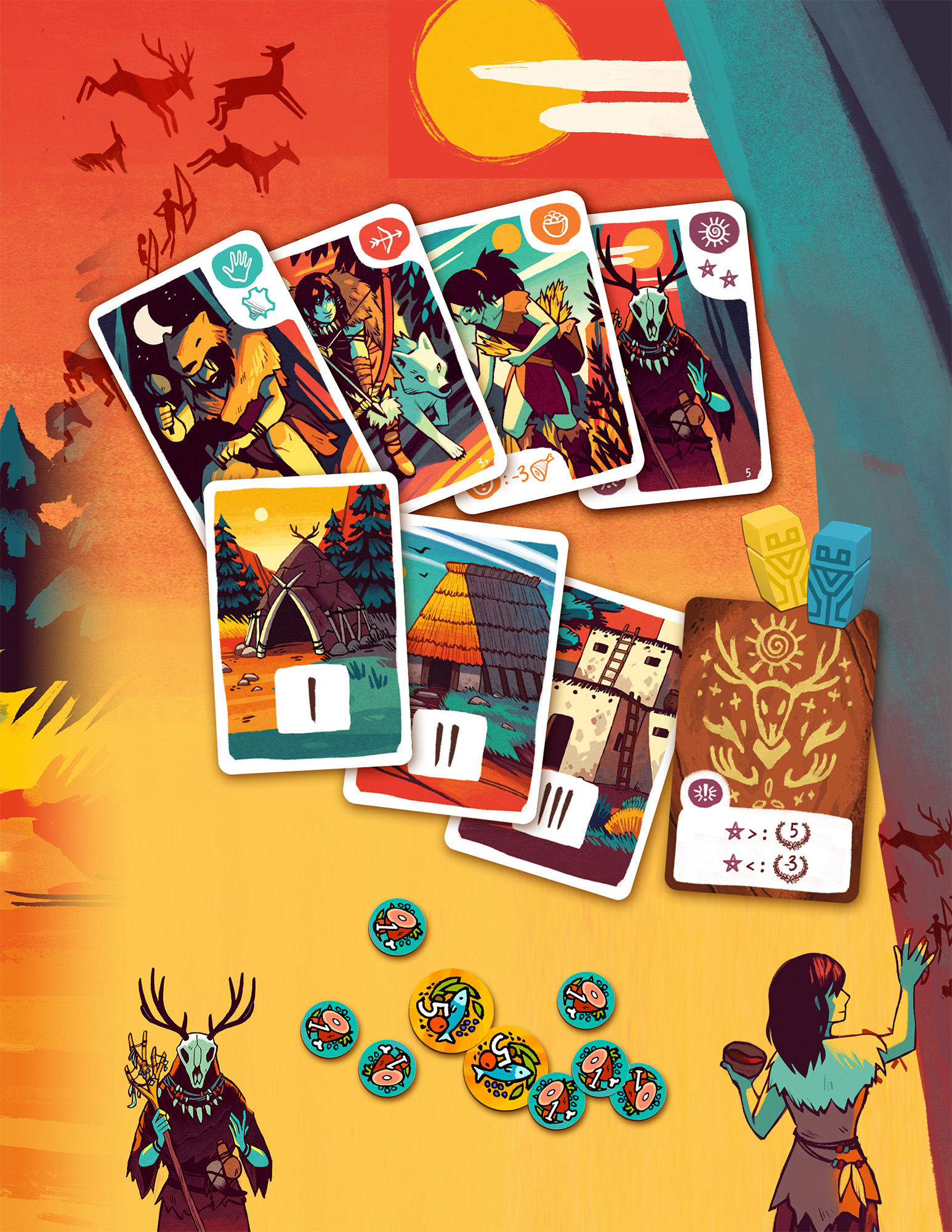 Each round, everyone places their totem on the offer track then, following the pawns’ order, will acquire character or building cards with which to grow their tribe. Each card has a specific effect and may earn prestige points as specialized buildings are constructed and players wisely face their challenges. Whoever can bring the most prestige to their tribe, wins.
