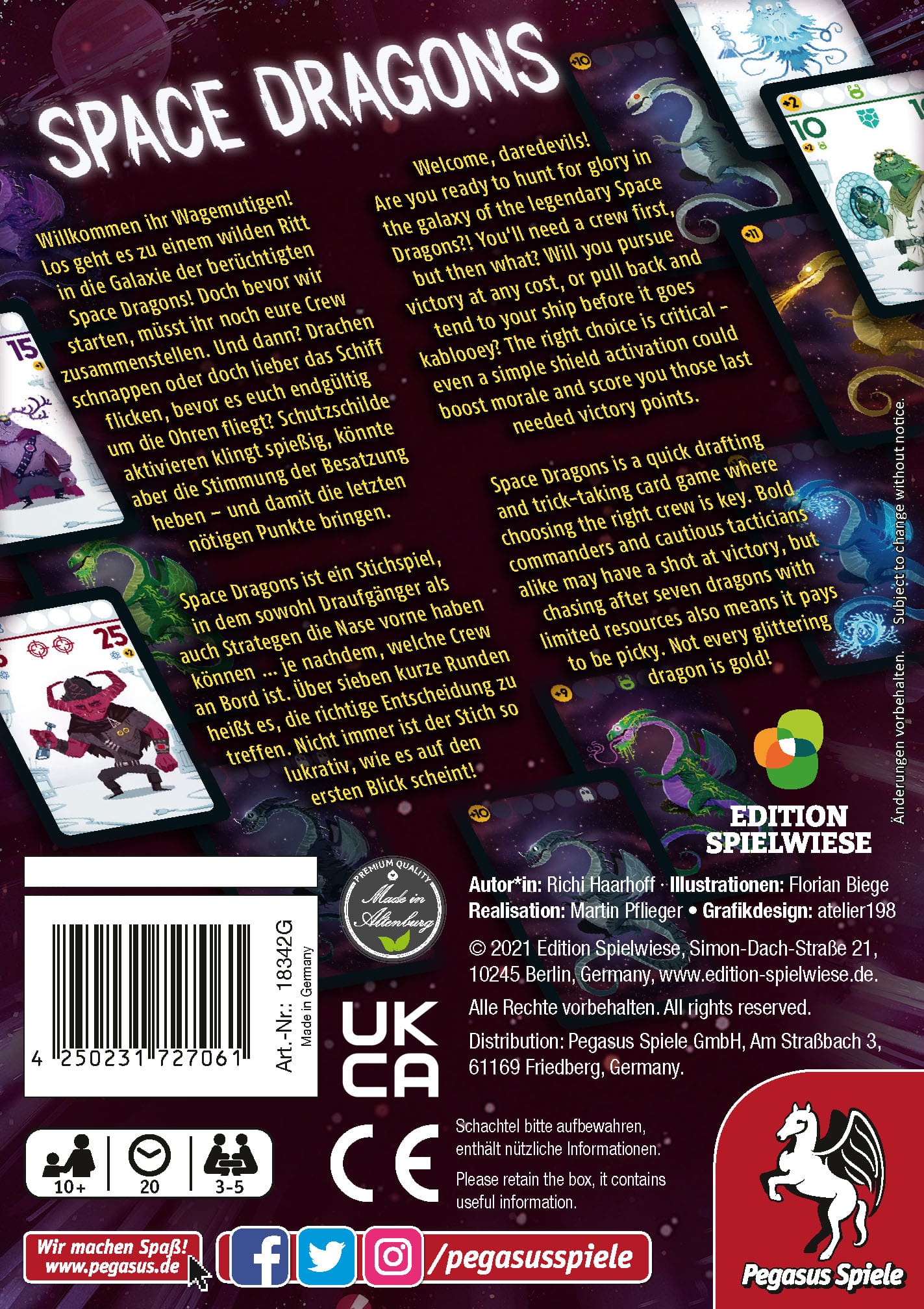 In the trick-taking game Space Dragons, the players first draft a crew of nine cards, then they play seven of them in order to score as many points as possible. Whoever plays the highest card in a trick wins the face-up dragon. In contrast to other trick-taking games, however, there are no suits to follow and the cards that were played remain in front of the respective players. They trigger special effects when played, but also grant victory points. With three double-sided scoring cards and a variant for an even faster game, there is plenty of variety.
