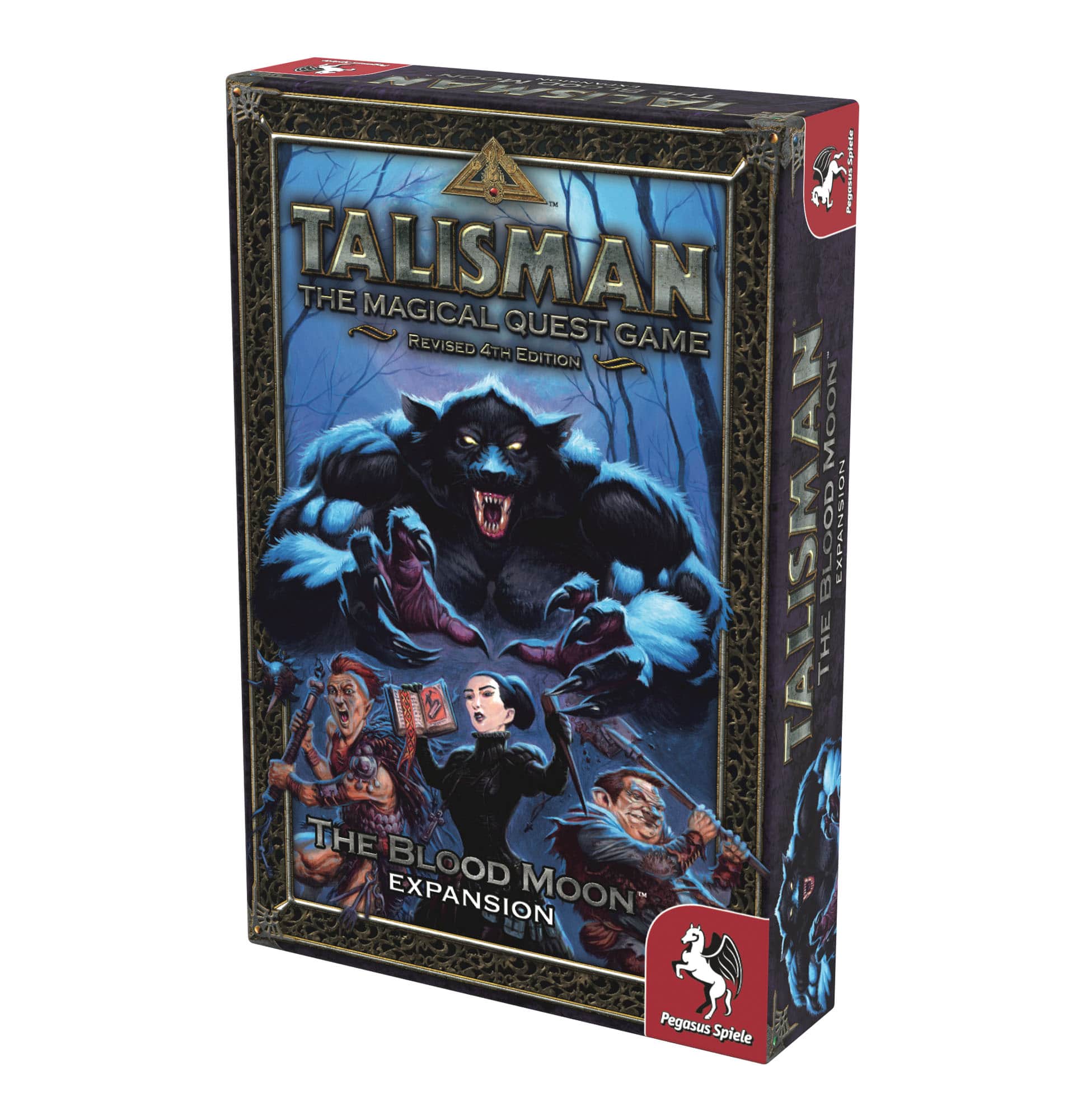 The Blood Moon expansion offers Talisman Revised 4th Edition players 111 new Adventure Cards, 10 new Spell Cards, 1 Time Card, 6 Lycanthrope Cards, 3 Alternative Ending Cards, 3 new character cards and plastic figures, and the Werewolf, a feral creature that players manipulate against each other. Can the heroes survive until daybreak?